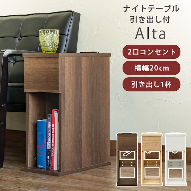 Alta ナイトテーブル 引出し付きです ベッドやソファサイドで役立つ幅約20センチとスリムなサイドテーブルです 雑誌や小物が置け、コンセント付きでスマホやタブレットの充電も出来ます コンセントは埃の進入を防ぐ仕様になっています ご使用の際は横にスライドさせながら差し込んで下さい 引出し1杯付きで、細かなものを収納できます 最大に引き出しても、抜け落ち防止のストッパー付きです ダークブラウン(DBR)、ナチュラル(NA)、ホワイト(WH)の3色展開です 商品詳細(サイズ・容量、規格) 幅200×奥行350×高さ507mm(梱包サイズ:幅510×奥行370×高さ110mm) 天板厚:約15mm 本体重量:7.1kg(梱包重量:8.2kg) 組立式(約35分/プラスドライバーをご用意下さい)1個口 メラミン化粧合板 2口コンセント付き(1500Wまで)、コード約1850mm 原産国:中国 rmd03