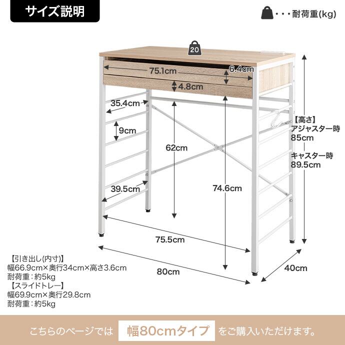 幅80cm×奥行40cm×高さ(キャスター装着時):89.5cm (アジャスター装着時):85cm